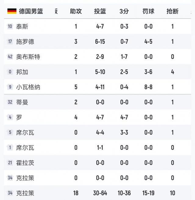 本场比赛,德国男篮首发五人三分球合计26中3,其中施罗德三分球7中0,奥布斯特5中0,小瓦格纳4中0,泰斯3中0,邦加5中2。