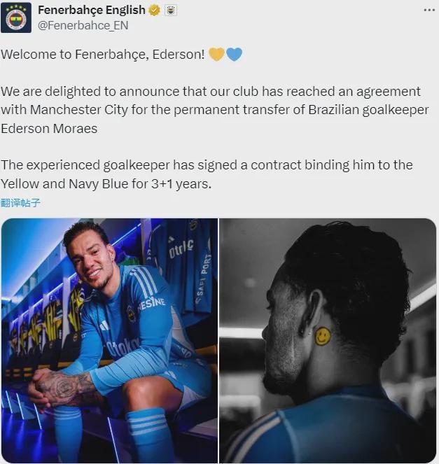 官方:费内巴切宣布从曼城签下了埃德森,这名门将签下了一份3+1合同。