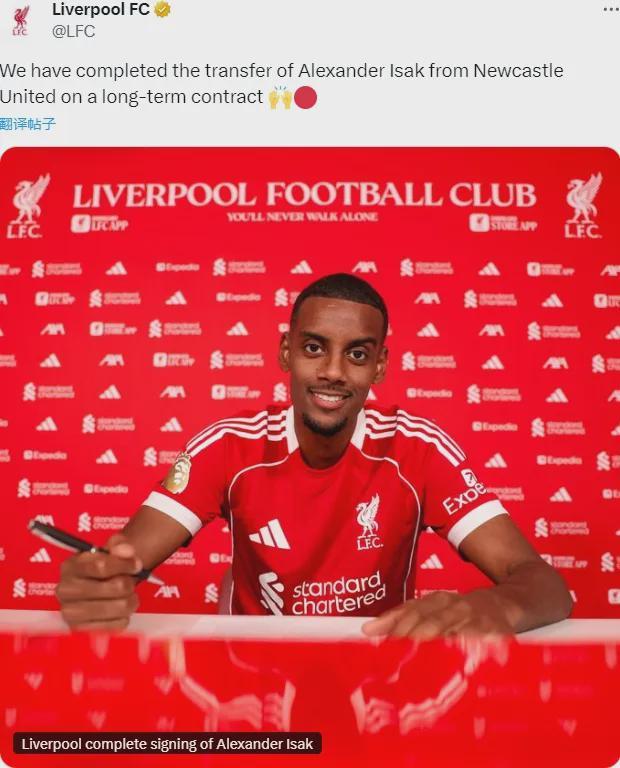 官方:利物浦宣布从纽卡斯尔签下了伊萨克