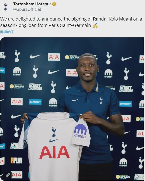官方:热刺宣布从巴黎租借签下了穆阿尼。