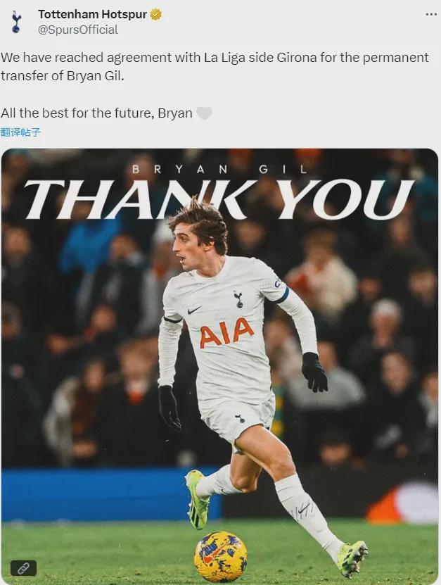 官方:热刺宣布和赫罗纳就布莱恩-吉尔的转会达成了协议。