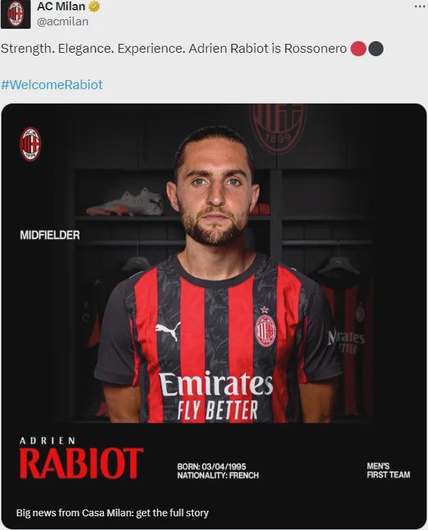 官方:米兰宣布从马赛签下了拉比奥特,双方签下了一份4年合同。