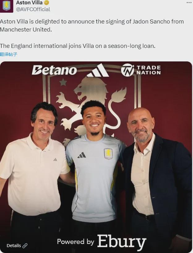 官方:维拉宣布从曼联租借桑乔一个赛季。