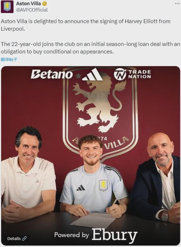官方:维拉宣布从利物浦签下了22岁的哈维-埃利奥特。