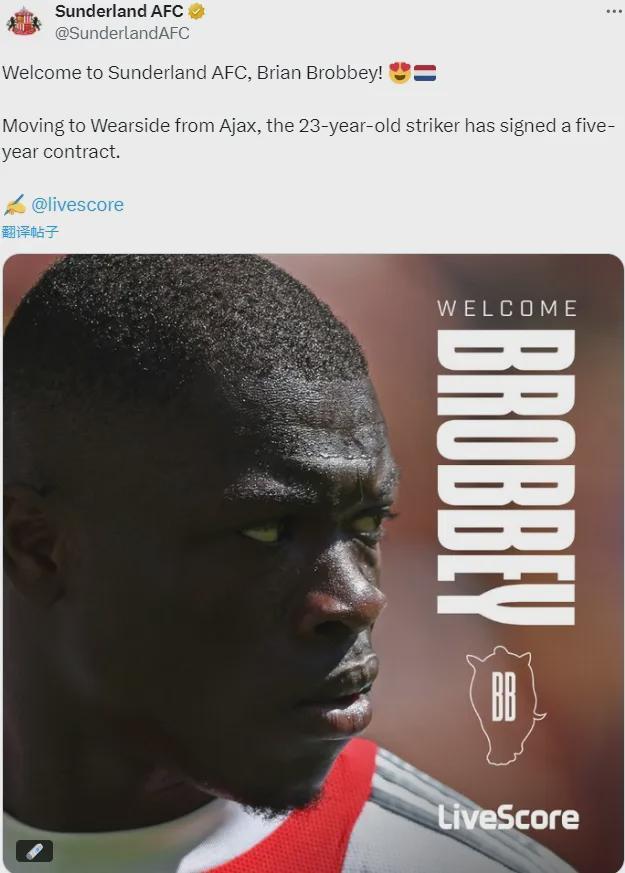 官方:桑德兰宣布从阿贾克斯签下了布莱恩-布罗比,双方签下了一份5年合同。