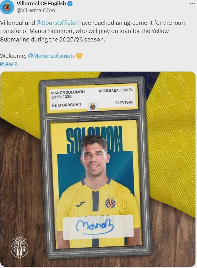 官方:比利亚雷亚尔宣布从热刺租借所罗门一个赛季。