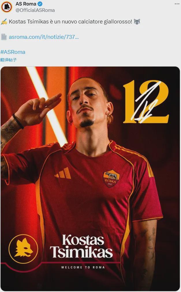 官方:罗马宣布从利物浦租借齐米卡斯一个赛季。