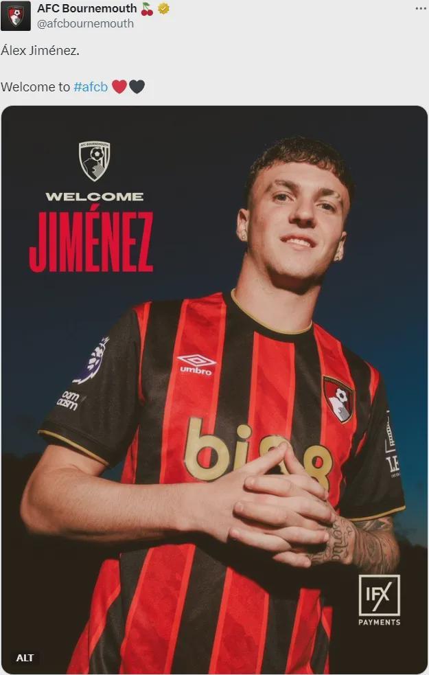 官方:伯恩茅斯宣布从米兰签下了阿莱克斯-希门尼斯。